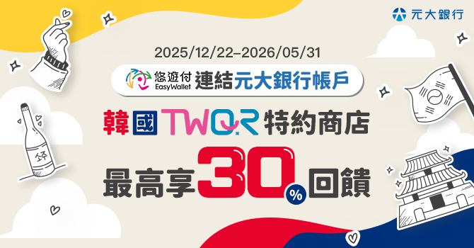 - 本活動所稱最高回饋30%,係指經綜合計算多項可疊加活動回饋之最高回饋率:即「元大銀行帳戶於韓國TWQR特約商店消費享每筆10%回饋」、「悠遊付錢包或綁定銀行帳戶扣款支付,每筆扣款享18.5%悠遊付回饋金」、「活動期間享免付1.5%海外交易手續費」計算之總回饋率,各項回饋適用之條件及注意事項應依各活動規範為準。