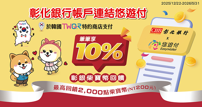 *活動期間內,以彰化銀行帳戶綁定悠遊付於韓國地區指定合作商店完成扣款交易,可享10%加碼回饋。