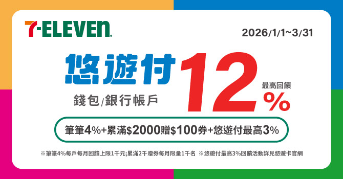 - 活動內容:使用悠遊付錢包或綁定銀行帳戶於7-ELEVEN門市消費,每筆扣款享4%悠遊付回饋金,當月累計消費滿2,000元加贈100元現金回饋券一份;活動期間同享「月級挑戰錢包/帳戶最高回饋3%」活動回饋,疊加優惠最高享12%回饋。1/2-3/27期間同享週五會員日筆筆2%回饋(活動詳情),疊加優惠最高享14%回饋。