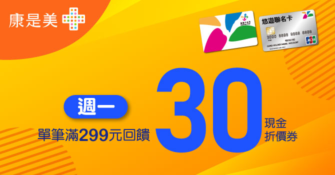 2. 單筆消費滿299元送30元現金折價券:於活動期間每週五至康是美實體門市嗶悠遊卡/悠遊聯名卡支付結帳金額(扣除不適用商品及折扣金額)達NT$299(含)以上,贈「康是美30元現金折價券」1張。本活動所贈送之「康是美30元現金折價券」限量5,000張,每卡每日限享優惠乙次,不得兌換現金及其他贈品,亦不得與其他店內優惠活動合併使用(以店內公告為準);消費贈券後如需退貨,須將本券一併歸還。活動詳情請見康是美官方網站