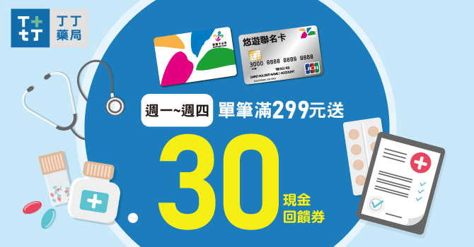 活動期間每週一至週四,悠遊付會員持記名悠遊卡/悠遊聯名卡於全台丁丁藥局實體門市,以悠遊卡功能單筆扣款消費滿299元(含)以上,即享30元悠遊付現金回饋券1份,單筆不累贈,每帳戶限領25份,總回饋券限量6,000份,送完為止。