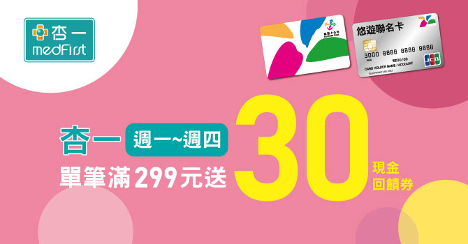 活動期間每週一至週四,悠遊付會員持記名悠遊卡/悠遊聯名卡於全台杏一醫療用品實體門市,以悠遊卡功能單筆扣款消費滿299元(含)以上,即享30元悠遊付現金回饋券1份,單筆不累贈,每帳戶限領25份,總回饋券限量6,000份,送完為止。