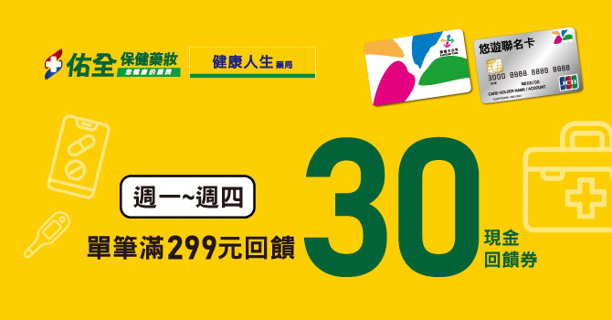 活動期間每週一至週四,悠遊付會員持記名悠遊卡/悠遊聯名卡於全台佑全保健藥妝/健康人生藥局實體門市,以悠遊卡功能單筆扣款消費滿299元(含)以上,即享30元悠遊付現金回饋券1份,單筆不累贈,每帳戶限領25份,總回饋券限量6,000份,送完為止。