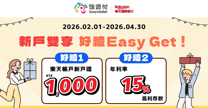 *悠遊付會員於活動期間輸入推薦序號「EASY」首次成功開立樂天國際銀行帳戶,並於開戶次月10號前使用悠遊付綁定該帳戶不限金額成功扣款滿1筆,享新台幣1,000元現金回饋至樂天國際銀行帳戶,每悠遊付會員限回饋1次(回饋名額無上限)。