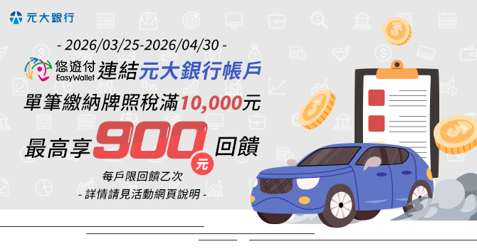 悠遊付連結元大銀行新臺幣活期存款帳戶繳納牌照稅,單筆金額滿10,000元贈100元悠遊付回饋金