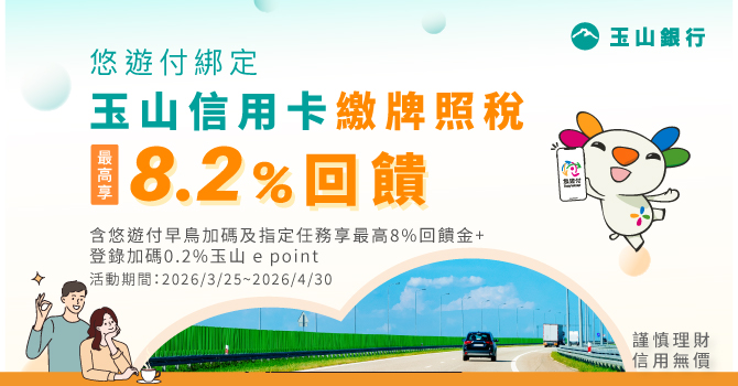 使用悠遊付綁定玉山信用卡繳納牌照稅,登錄享0.2% e point點數回饋,登錄名額無上限,活動期間每歸戶回饋上限50點。