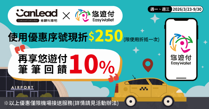 悠遊付會員活動期間內每週一、三使用「肯驛叫車吧」之機場接送服務,使用悠遊付消費(以悠遊付錢包/綁定銀行帳戶/綁定信用卡扣款),在預約頁面輸入優惠序號「EW6LL4」,即可享有單筆折抵新台幣(下同)250元之優惠(限使用1次);並依折抵後實際扣款金額,再享筆筆10%悠遊付回饋金,活動期間每悠遊付會員回饋上限為100元悠遊付回饋金,本活動回饋金總額以10萬元為上限,送完為止。