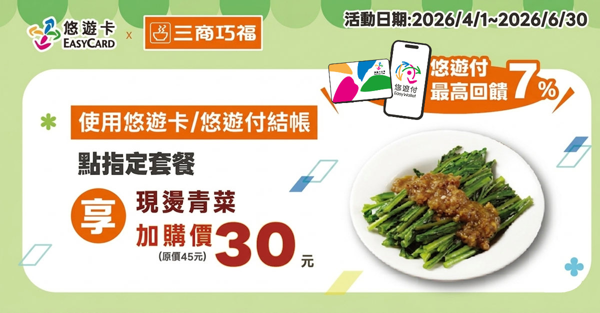 活動期間持悠遊卡/悠遊聯名卡/悠遊付於三商巧福購買指定套餐,即享30元加購現燙青菜(原價45元)。