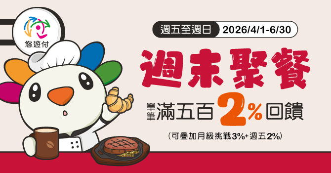 活動期間每週五至週日於指定餐廳品牌使用悠遊付錢包或綁定銀行帳戶,單筆扣款滿500元(含)以上,享2%回饋,每戶每月回饋上限50元,每月總回饋上限6萬。