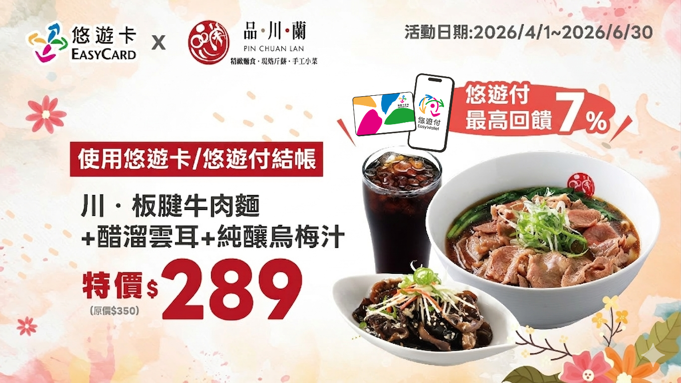 活動期間持悠遊卡/悠遊聯名卡/悠遊付至品川蘭購買 川‧板腱牛肉麵+醋溜雲耳+純釀烏梅汁特價289元(原價350元)。