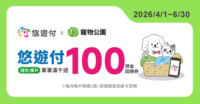活動期間於寵物公園、貓狗隊長、凱朵美容指定門市,使用悠遊付錢包或綁定銀行帳戶單筆扣款滿1,000元,贈100元現金回饋券(單筆不累贈),每戶每月最高回饋上限3張,每月限量500張。若單一月份回饋券發送總量如達上限,則該月活動提前結束,並於悠遊付APP公告(路徑:APP首頁>點擊「悠遊付專屬」按鈕>點擊本活動頁)。