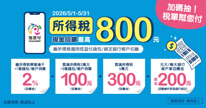 • 高額加碼禮活動期間使用悠遊付錢包或綁定銀行帳戶繳納所得稅累計滿50,000元再加贈300元悠遊付回饋金1份,每戶限贈1份,限量700名。