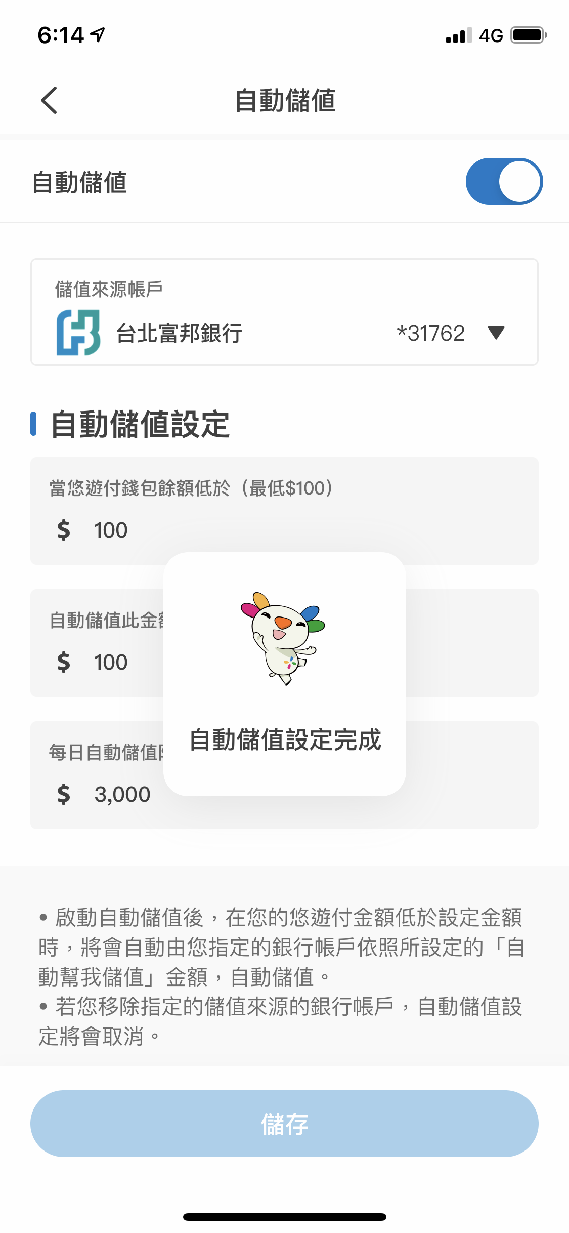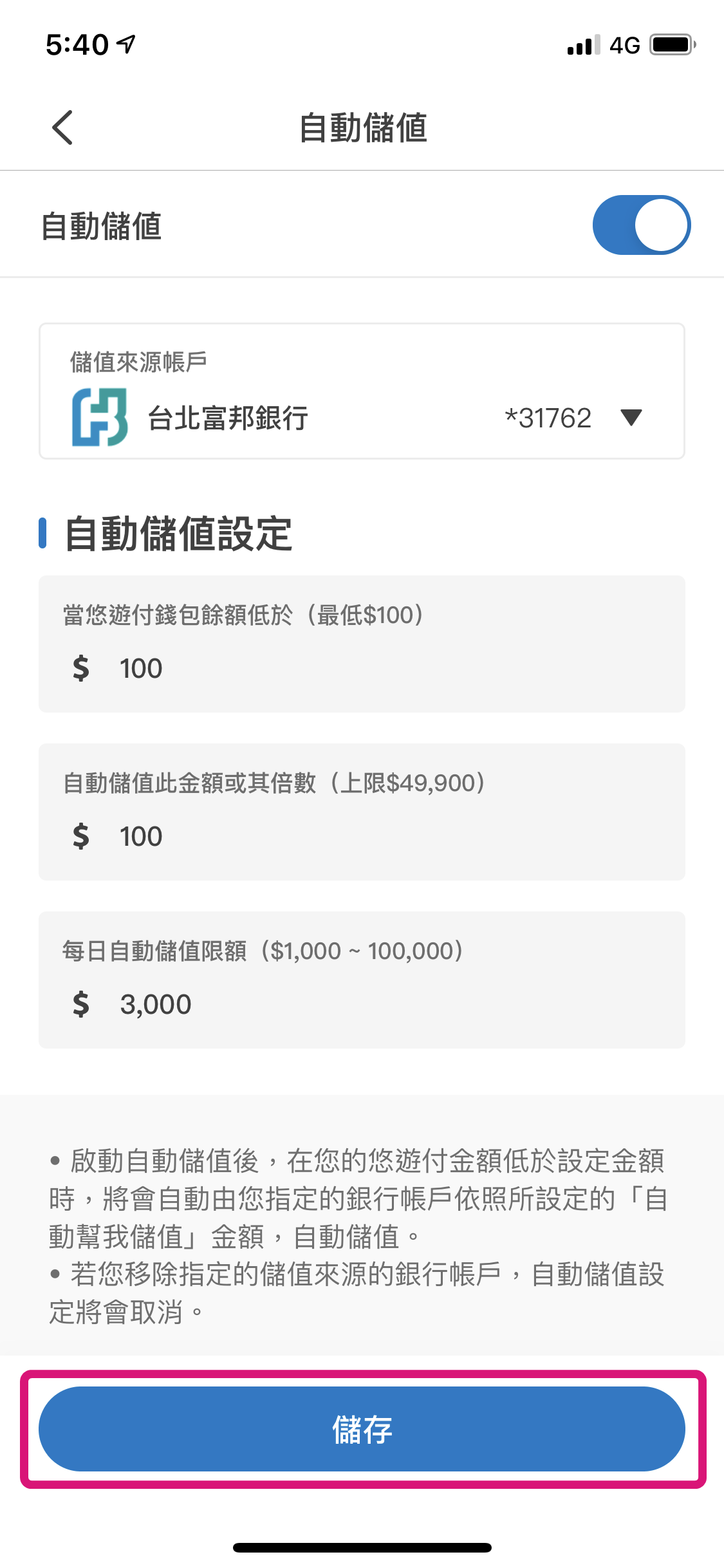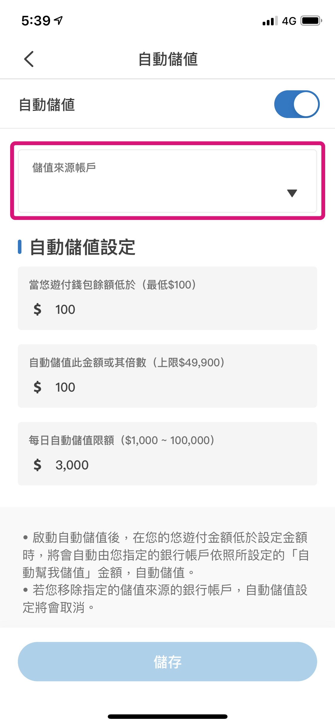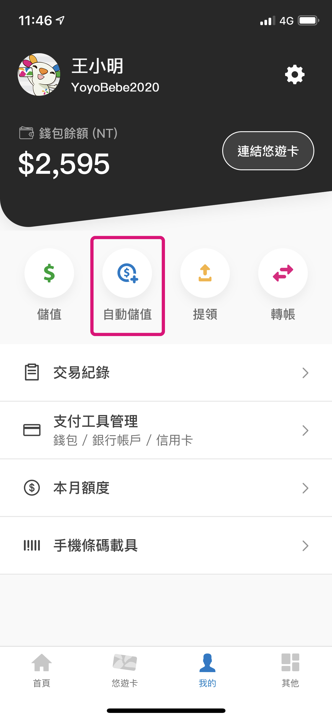 1. 於「我的」頁面中點擊「自動儲值」按鈕。
